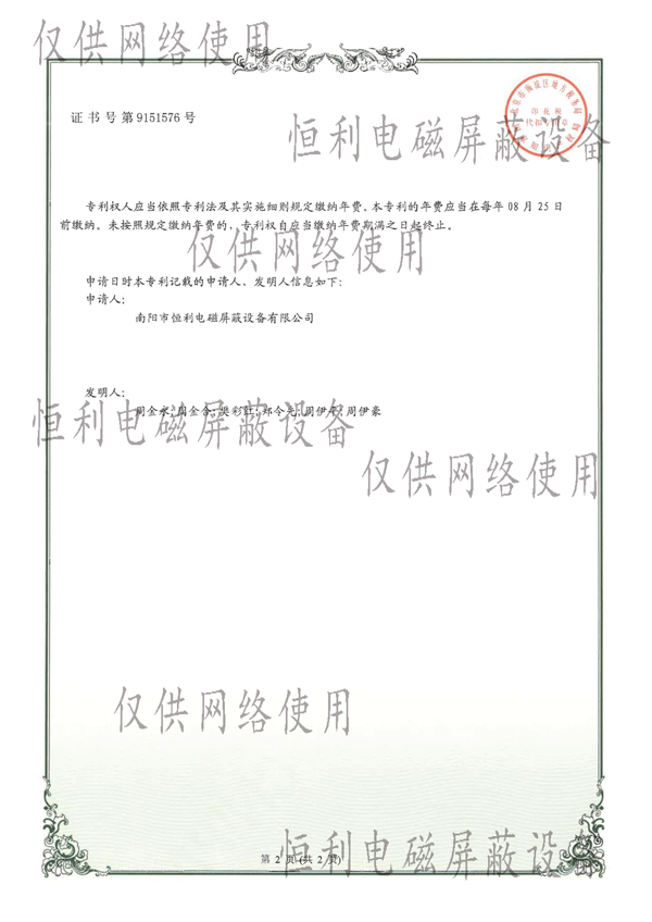 電磁屏蔽門(mén)用門(mén)鎖裝置專(zhuān)利證書(shū)展示圖